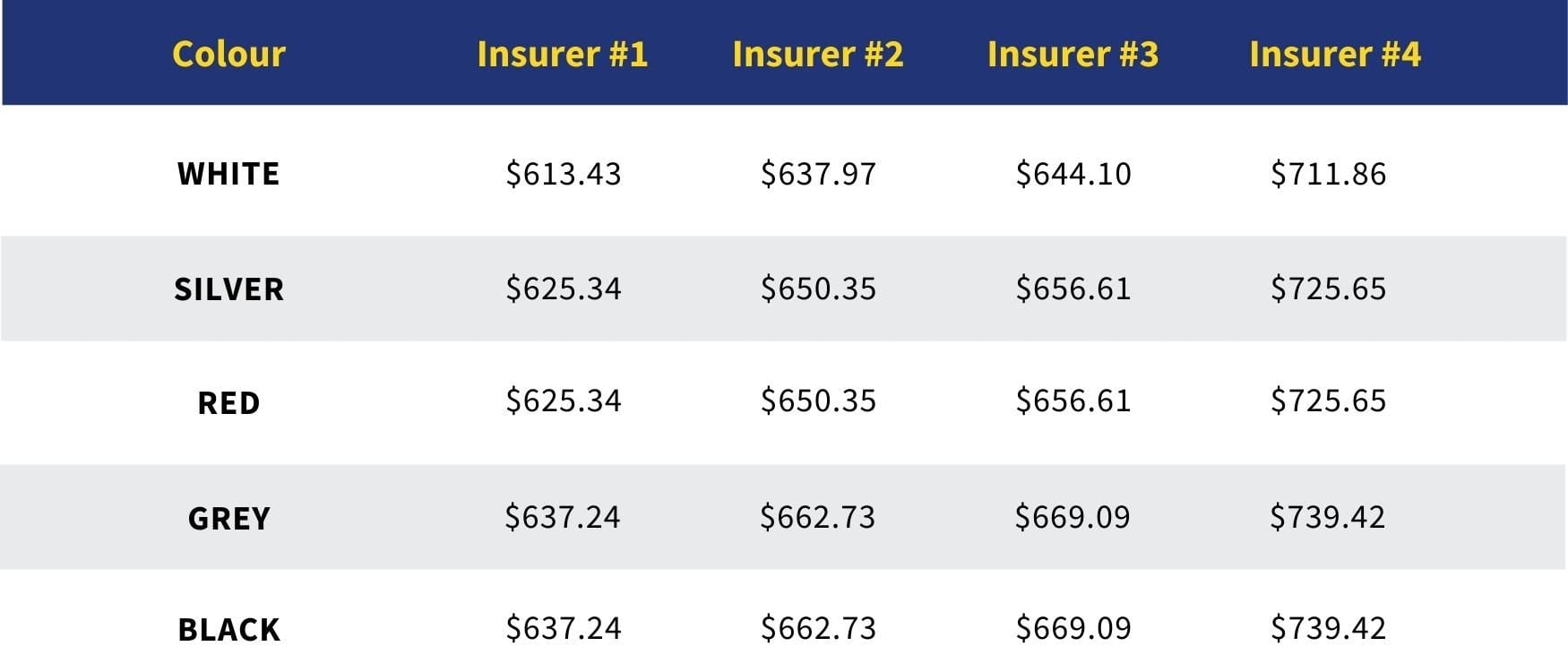 However, there are a few things to keep in mind and potentially ask insurers when you are researching their cover products. Metallic and Pearl Shades of PaintOne of the main reasons behind the thought that the colour of paint affects the price of insurance is not so much the shade but the type of paint. Metallic and pearl paint colours can be costly for the insurer to replace or repair and so they may factor this into their premium pricing. A car costs more with premium paint and may cost more to repair than regular paint. Compare the Market created the following table that shows quotes from 4 different insurers for the same make and model car (2014 automatic Toyota Camry), driven by a 25 year old male, who parks it in the garage, the only difference being the colour. ![]()